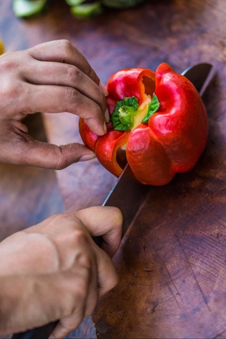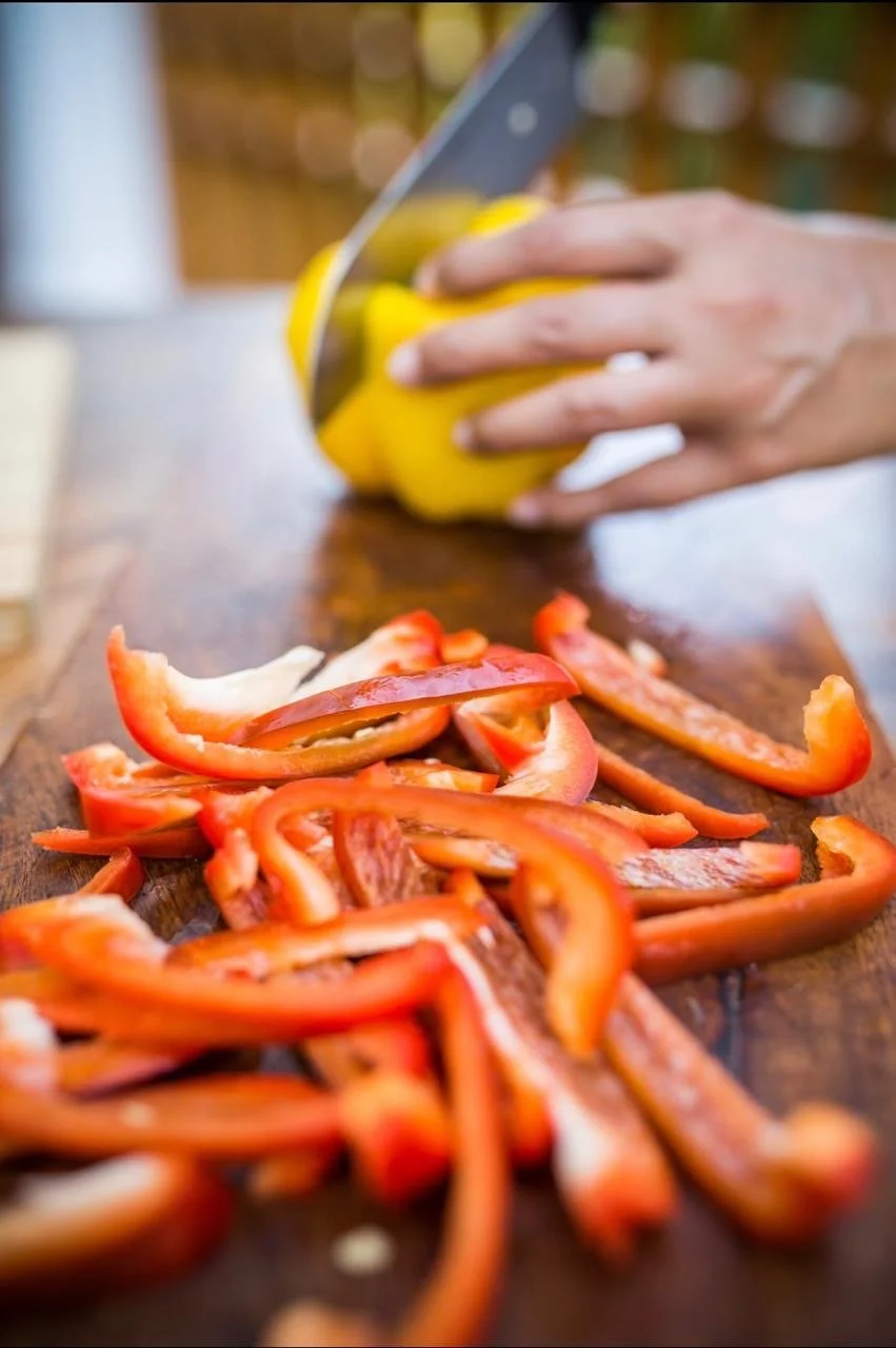 1. Sauté peppers, tomatoes, onions, garlic, red chilies in olive oil untill cooked and soft. Add chopped coriander.