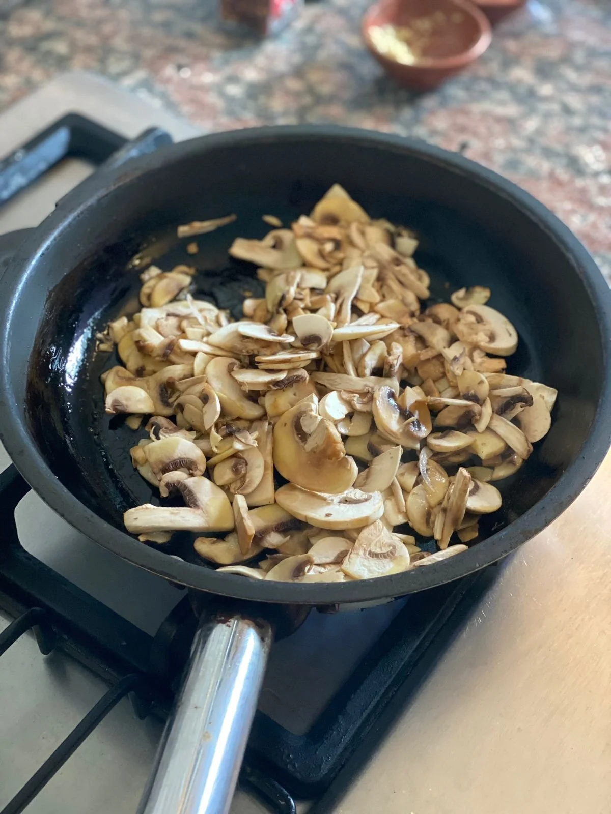 Sauté the mushrooms in a heated pan with some olive oil till all the moisture is evaporated and mushrooms start browning. Then, add the garlic, thyme and salt.